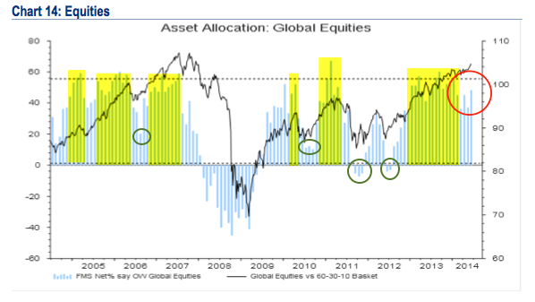 Remarkably, although US bonds have outperformed SPX so far in 2014, fund managers are still hugely underweight. In June, weightings fell to their lowest in 6 months. If there is a hated asset class, it’s not equities, it’s bonds.