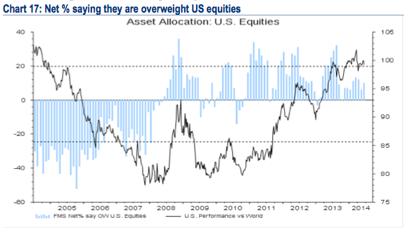 You can see from the data that it should mostly be looked at from a contrarian perspective. Fund managers were overweight EEM more than any other market at the start of 2013, and it was the worst performer in the following year. In comparison, they were 20% underweight